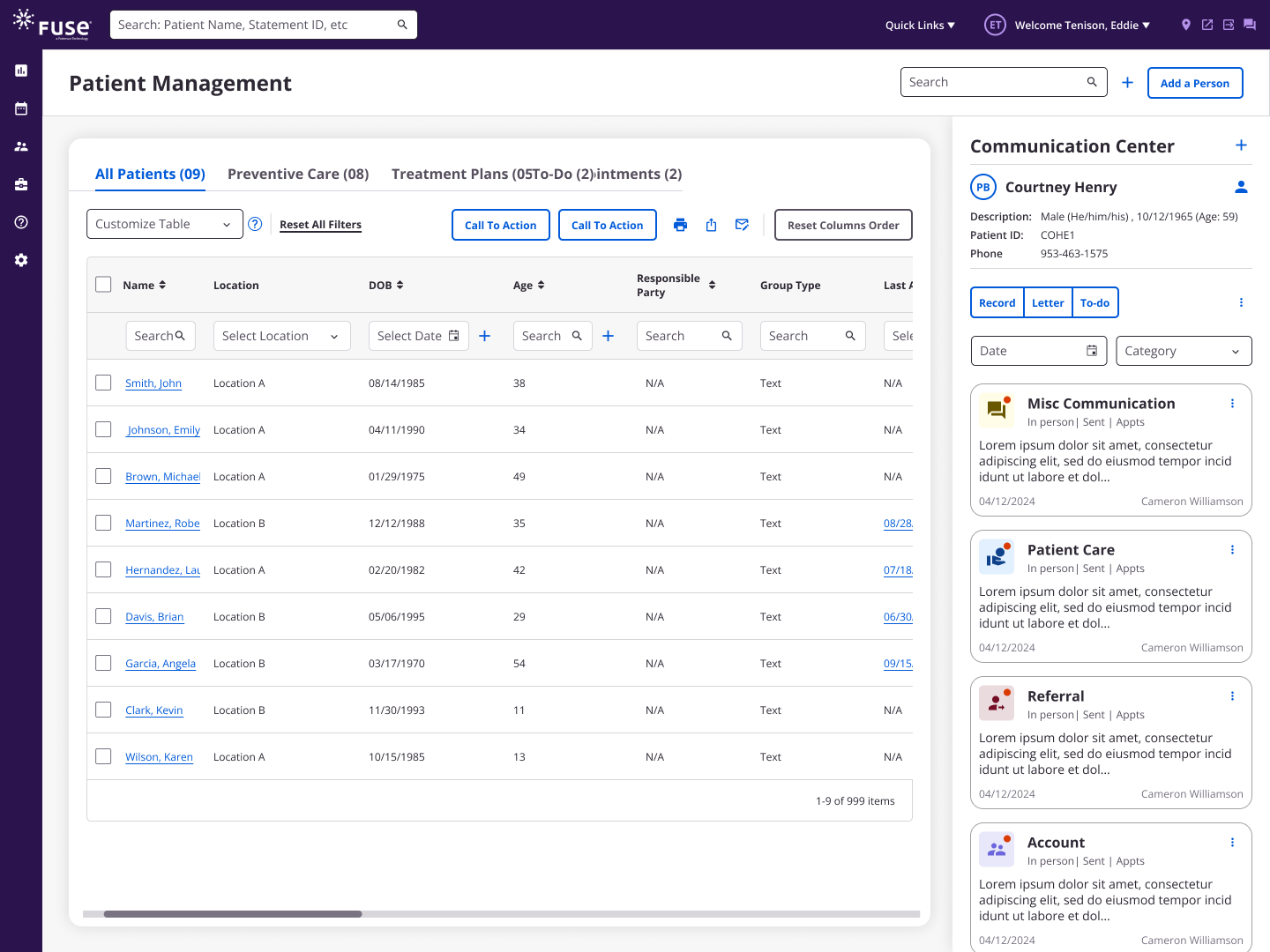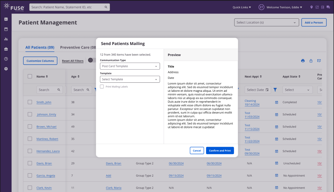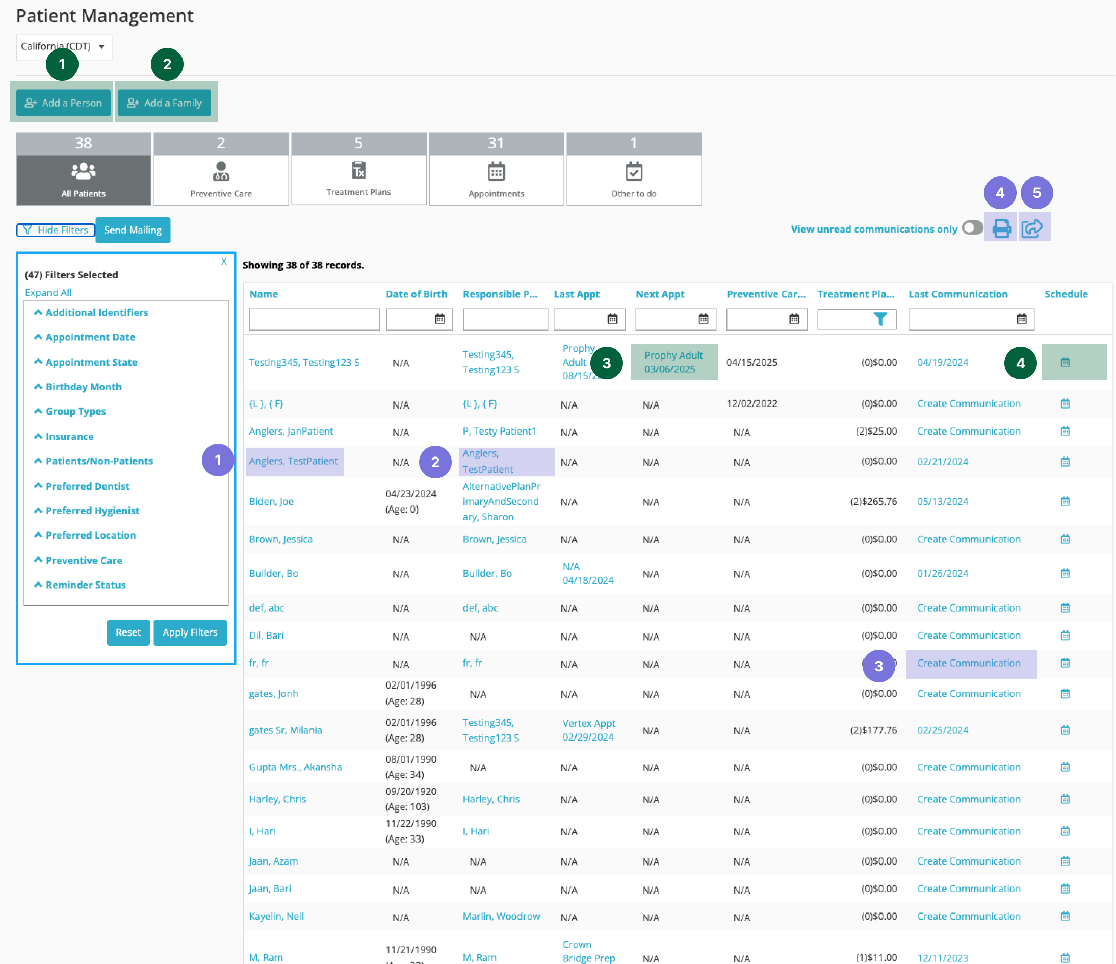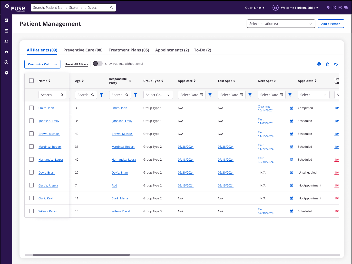 The Patient Management page allows users to view a comprehensive list of patients, displaying key information, treatment history, preventive care schedules, and appointment statuses.