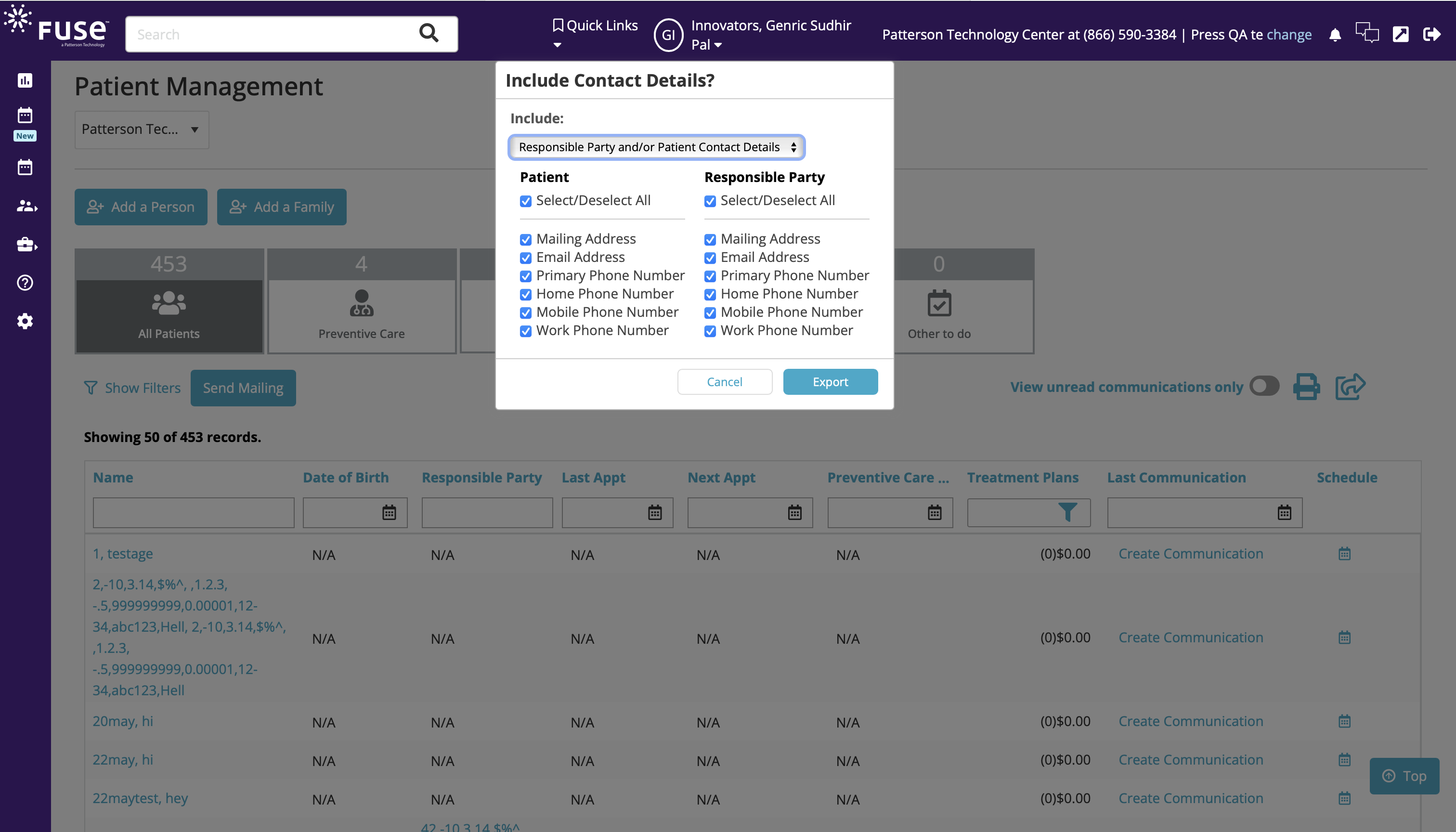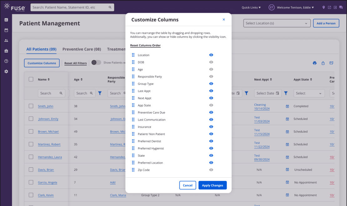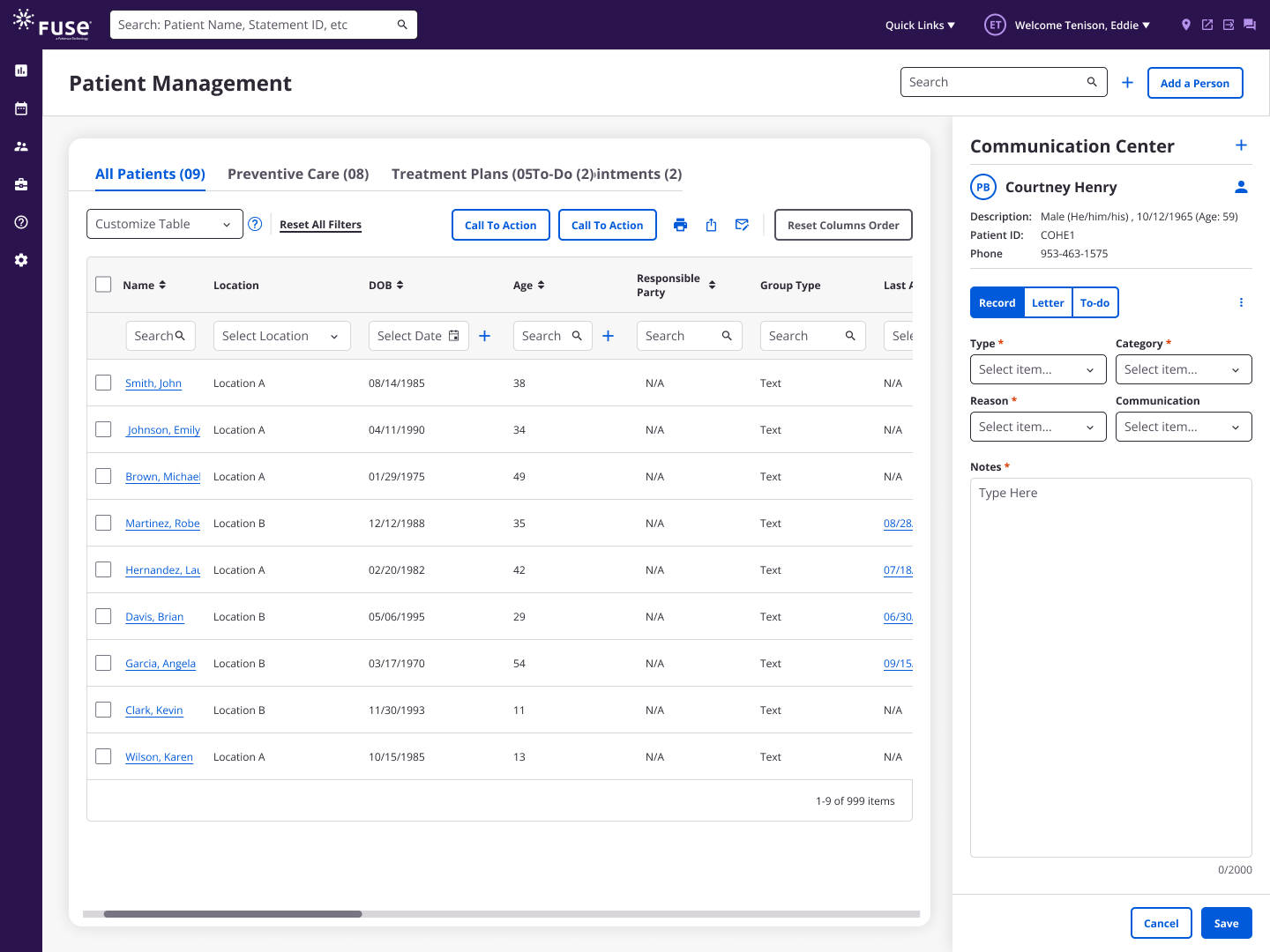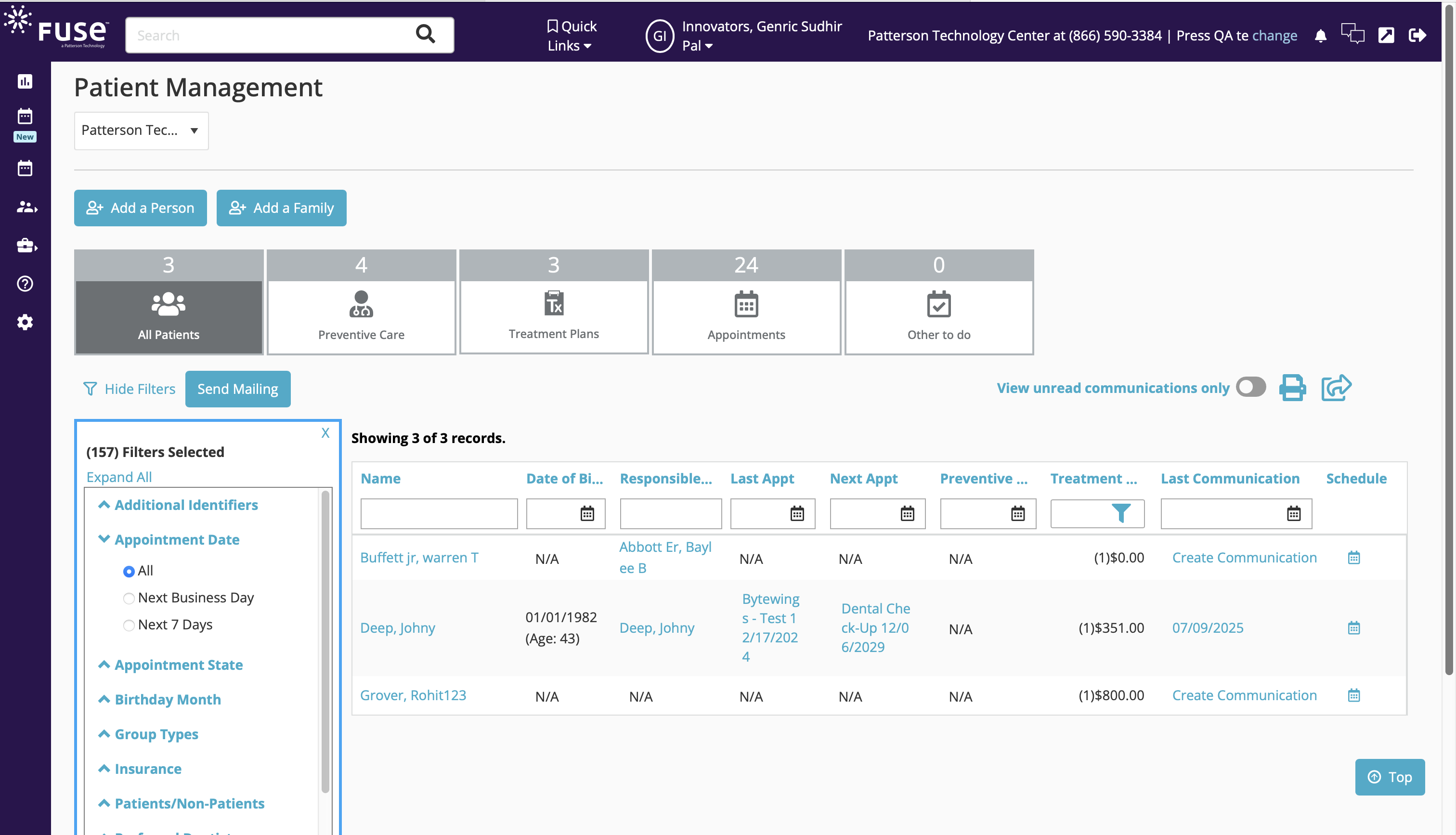 The Patient Management page allows users to view a comprehensive list of patients, displaying key information, treatment history, preventive care schedules, and appointment statuses.